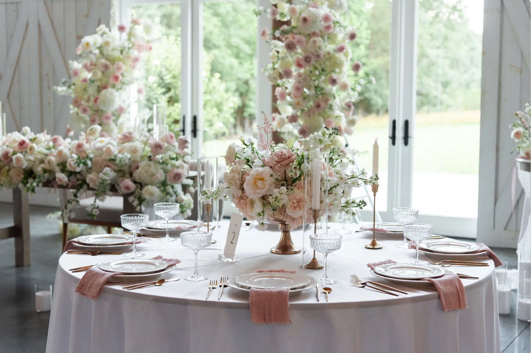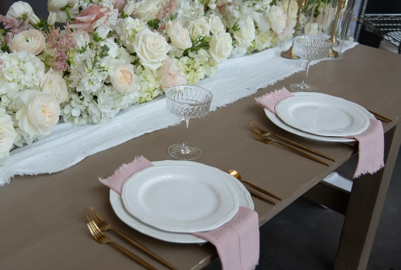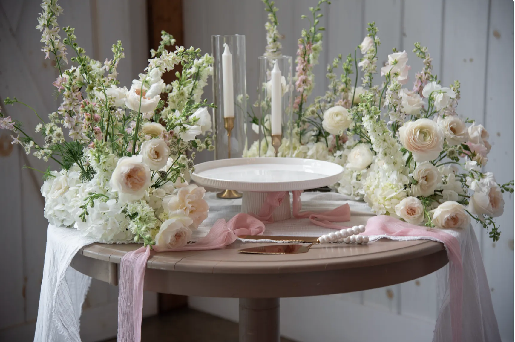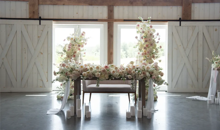 Package includes wedding arch, linens, dinnerware, decorative elements and candles for your guest tables, as well as a fully styled sweetheart table and cake table.